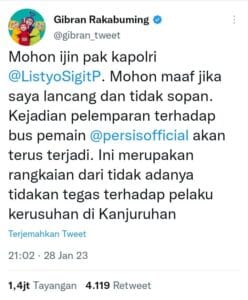“Mohon izin pak kapolri Listyo Sigit. Mohon maaf jika saya lancang dan tidak sopan. Kejadian pelemparan terhadap bus pemain Persis akan terus terjadi. Ini merupakan rangkaian dari tidak adanya tindakan tegas terhadap pelaku kerusuhan di Kanjuruhan,” tulis Gibran dalam cuitannya di Twitter.