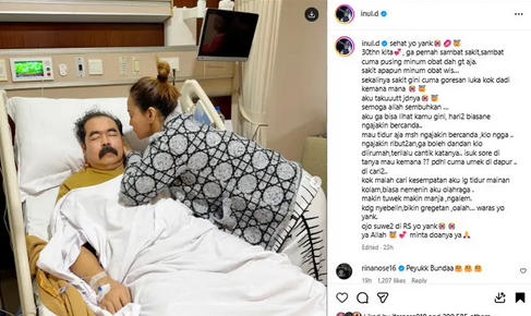 “30 tahun kita gak pernah sambat sakit, cuma pusing minum obat udah gitu aja. Sekalinya sakit gini cuma goresan luka kok dadi kemana-mana, aku takut jadinya,” tulis Inul.
