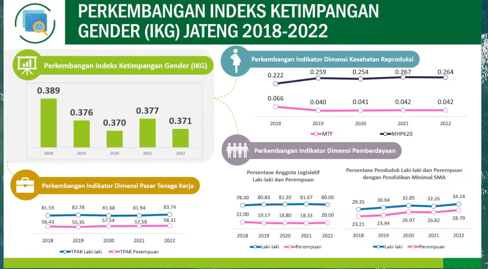 Menurut data BPS Jateng, IKG Jawa Tengah tahun 2022 tercatat 0,371 turun 0,006 poin dibandingkan 2021 yang mencapai 0,377. Hal ini disebabkan karena perbaikan dimensi kesehatan reproduksi dan dimensi pasar tenaga kerja.