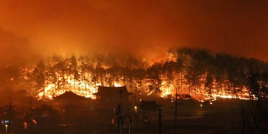 Api melahap lahan perkebunan dan meluas hingga ke hutan.