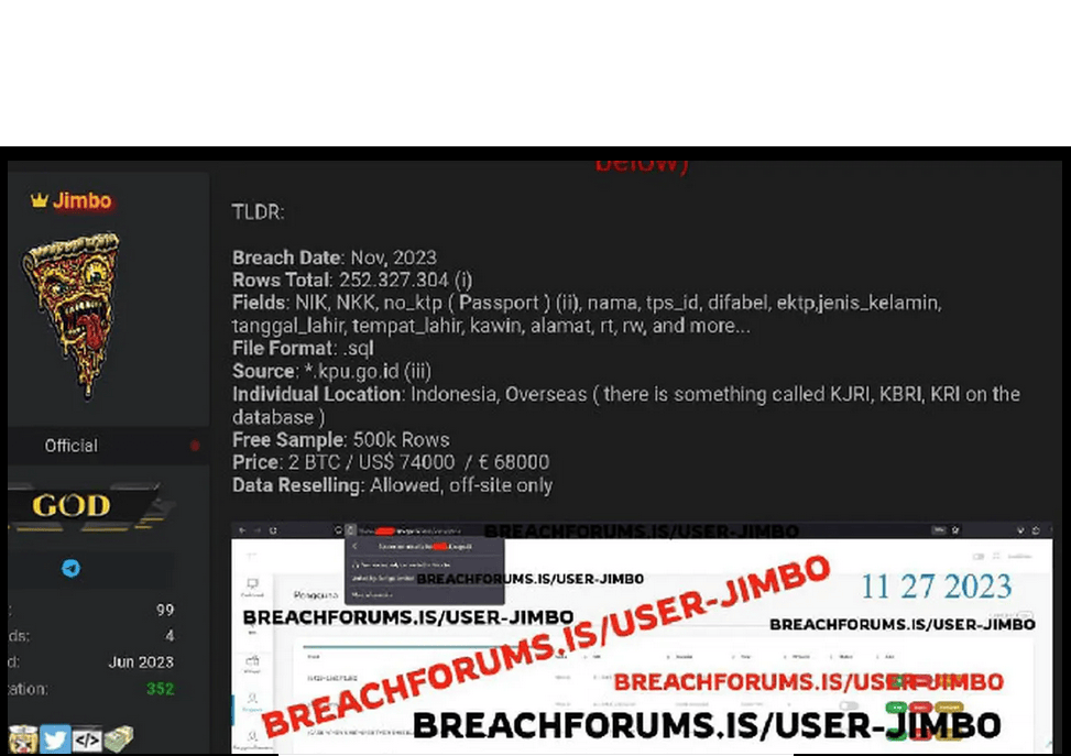 Data yang berhasil diperoleh hacker Jimbo mencakup NIK, Nomer KK, nomor KTP (berisi nomor paspor untuk pemilih yang berada di luar negeri), nama lengkap, jenis kelamin, tanggal lahir, tempat lahir, status pernikahan, alamat lengkap, RT, RW, kode kelurahan, kecamatan, kabupaten, serta kode TPS.