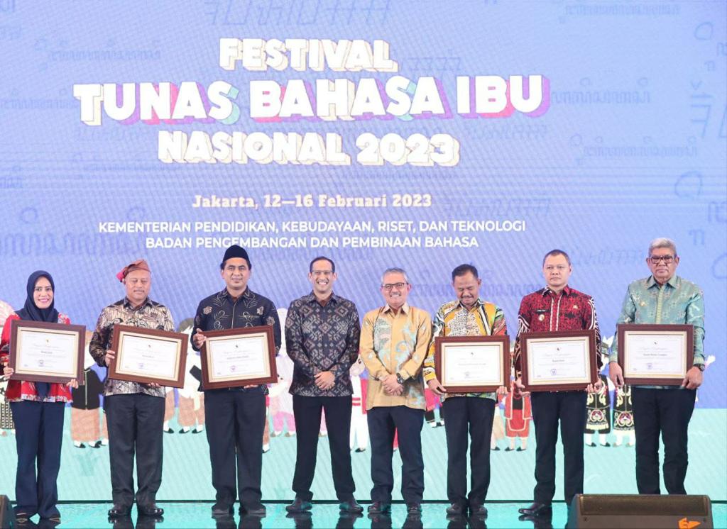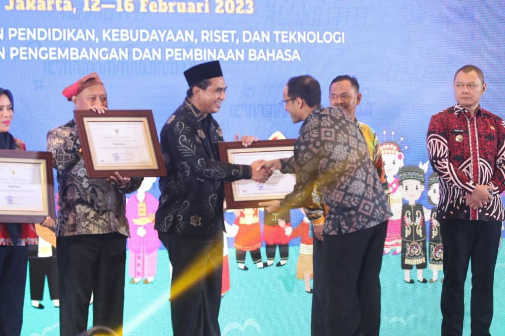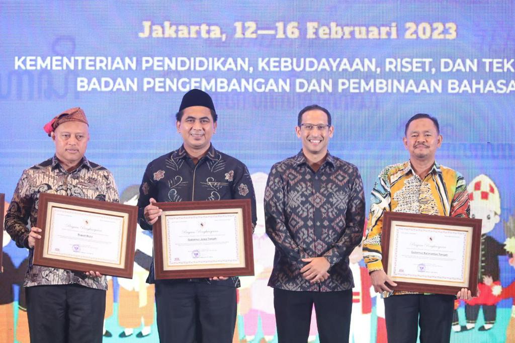 JAKARTA, liputanbangsa.com – Kementerian Pendidikan, budaya, riset dan teknologi (Kemendikbud Ristek) RI melalui Mendikbud Ristek, Nadiem Anwar Makarim menganugerahkan Revitalisasi Bahasa Daerah Tahun 2022 kepada Wakil Gubernur Jateng, Taj Yasin Maimoen mewakili Pemerintah Provinsi Jawa Tengah di Hotel Sultan, Jakarta, Senin (13/02/2023) malam.
