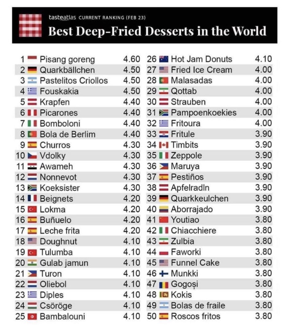 Tiap tahunnya Taste Atlas merilif daftar makanan terbaik dalam bebagai kategori, salah satunya adalah kategori most popular deep-fried desserts untuk kuliner pencuci mulut yang paling terkenal.