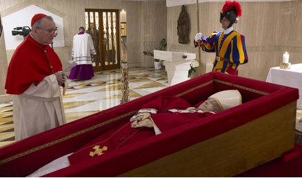 Vatikan merilis foto-foto Fransiskus yang mengenakan jubah kebesarannya dan memegang rosario, terbaring dalam peti mati terbuka di kapel kediamannya di Santa Marta, tempat ia tinggal selama 12 tahun masa kepausannya.