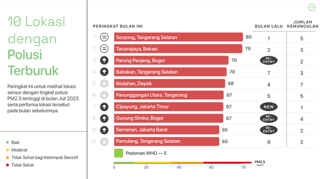 Berdasarkan hasil pemantauan Nafas selama bulan Juli 2023, Serpong, Tangsel, menjadi lokasi paling berpolusi di Indonesia dengan rata-rata PM2.5 yang dihasilkan 80 µg/m³, ditandai kode warna merah atau tidak sehat untuk semua orang.