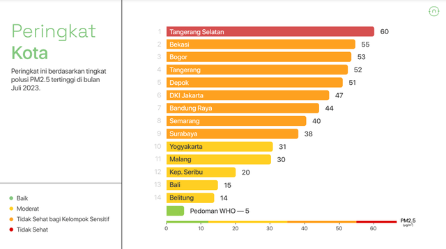 Sedangkan rata-rata kualitas udara Tangsel, Bogor, Bandung Raya, DKI Jakarta, dan D.I. Yogyakarta konsisten melampaui batas tersebut selama dua bulan terakhir.