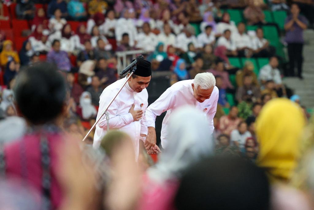 Di akhir sambutan, Ganjar yang didampingi Taj Yasin Maimoen memberikan salam hormat dengan menundukkan badan ke arah masyarakat.