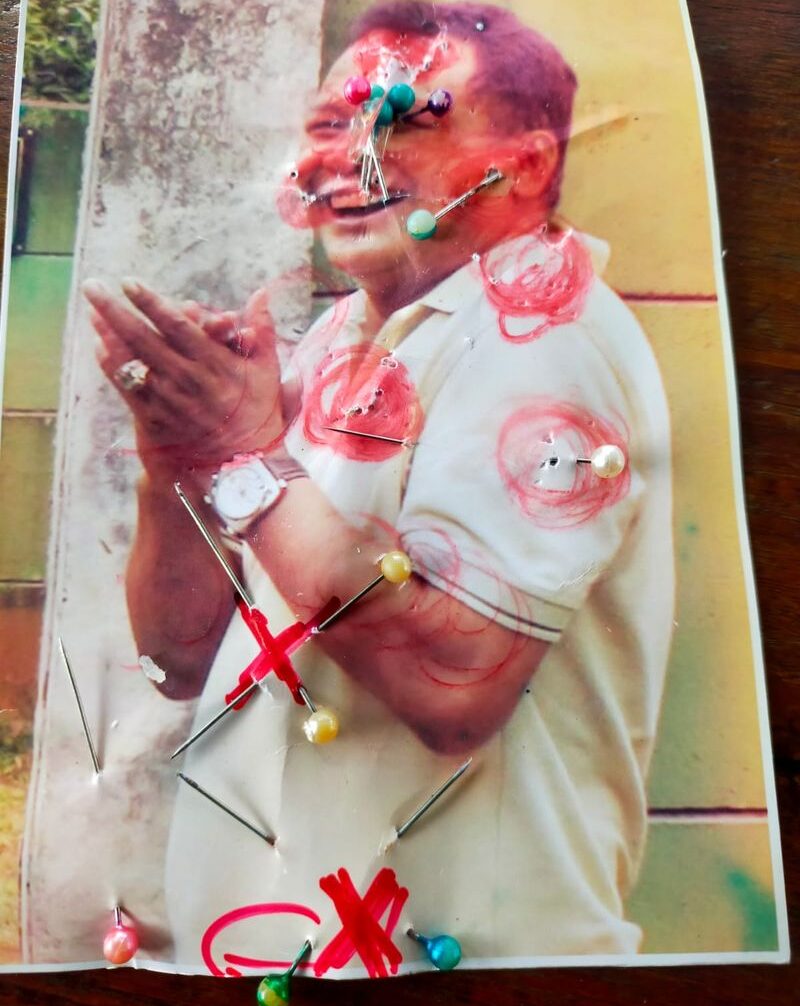 Menurut pengakuan Aat, ia melihat kondisi foto yang ada di kediaman H nampak tertusuk jarum di bagian matanya.